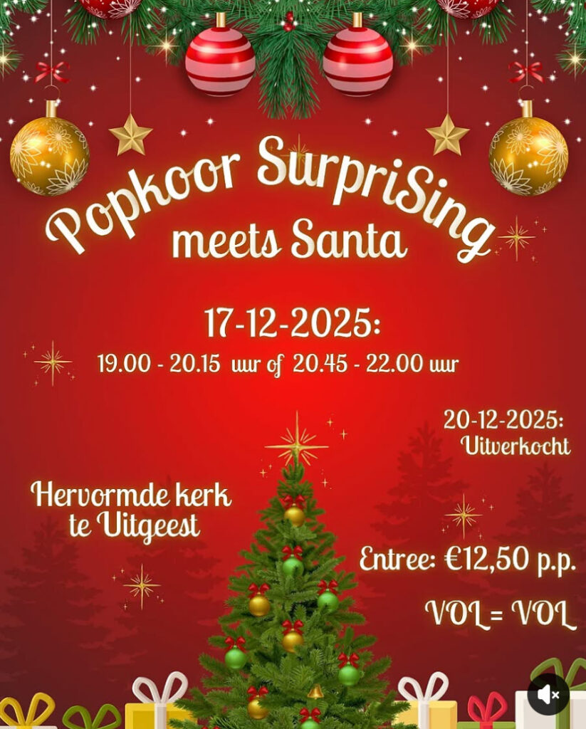 In december geven we nog diverse concerten waaronder vier kerstconcerten in een kerkje in Uitgeest.( voor wie naar ons wil luisteren: er zijn nog een aantal kaarten voor de woensdag. Mail even naar bestuur.surprising@gmail.com of stuur mij een berichtje dan regel ik het voor je)